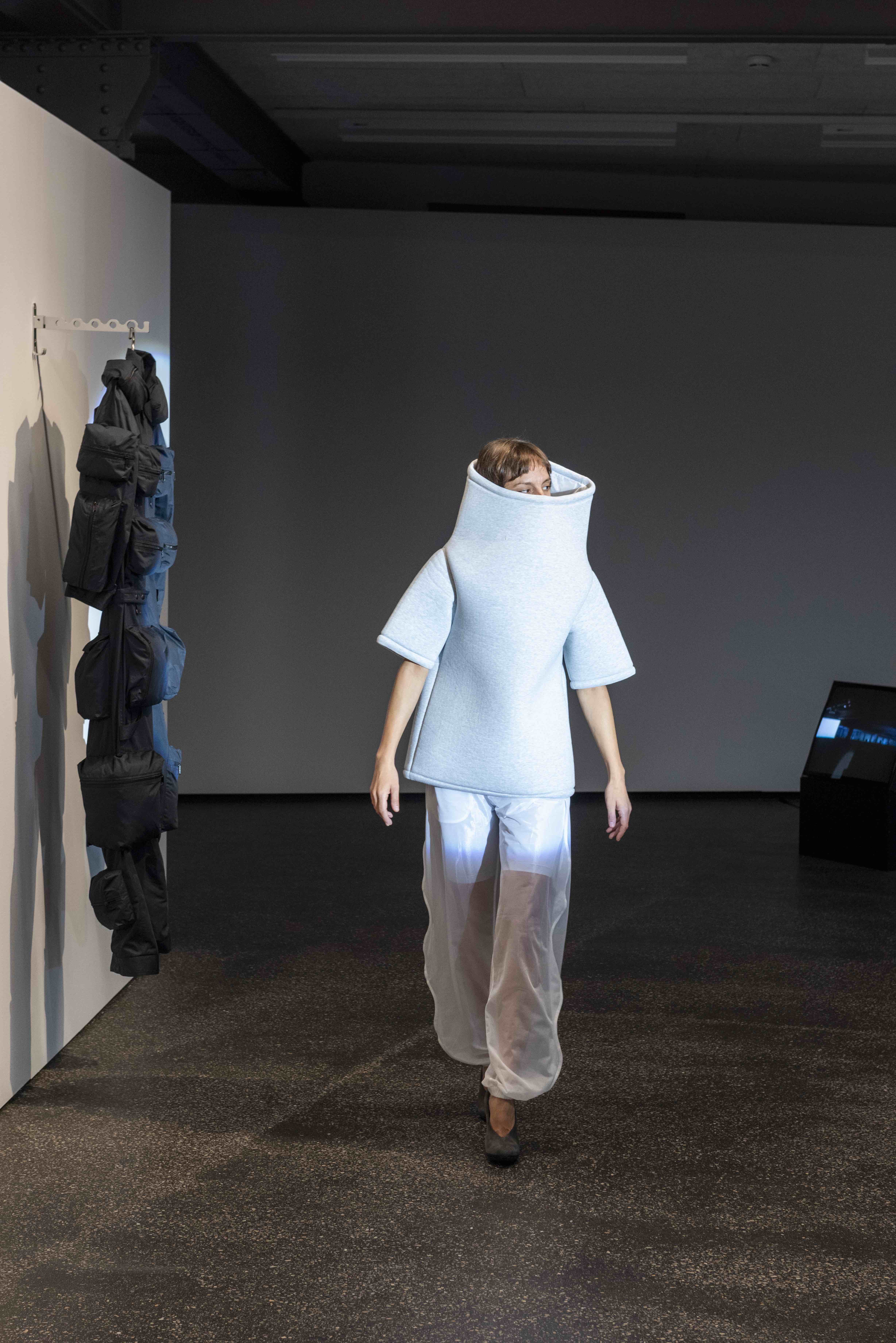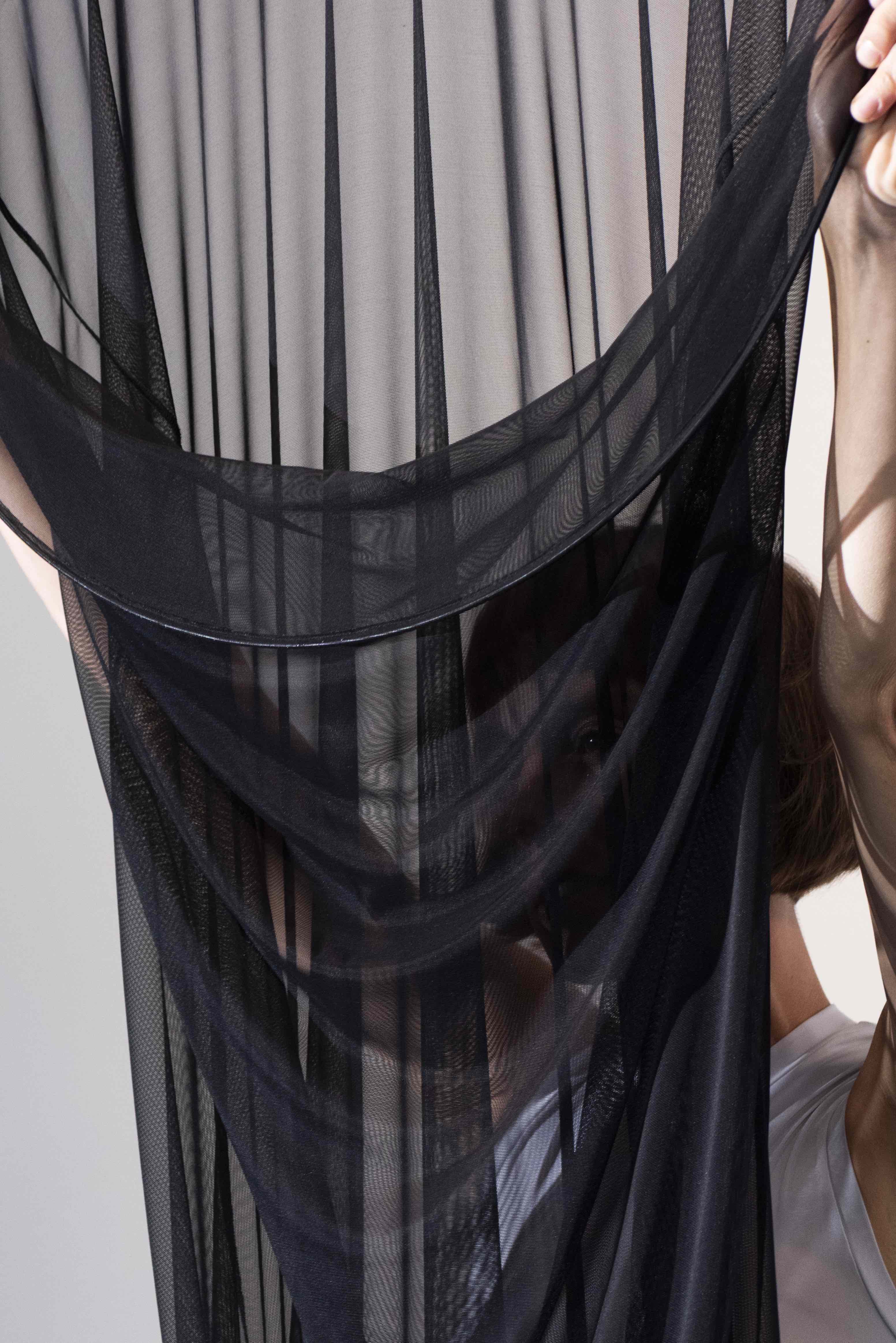 SUPERIMPOSITION - a composition in which no melody is recognisable. The work is conceived as a performative act, a fashion show that recalls ancient rituals in which the performers and the audience become a single body on stage. The garments made of sound-absorbing fabrics, which look like sculptural dresses, have been presented in a fashion-show-like choreography. The textile materials, identified with the technical-scientific support of the Politecnico di Torino, are capable of refracting and absorbing sound pressure. These armour suits are designed as empirical protections for the ear and the body. The fashion design of the garments has been developed with the MARIOS brand through shared experimentation and a creative contamination that intends to look from the avant-garde supremacist models to the oriental tradition. The scenic and sound dramaturgy of the performance, which was presented in the Great Hall of the historic Cercle Cit in Luxembourg at the end of April, has also been interpreted in the video work realised through is multi-point direction.